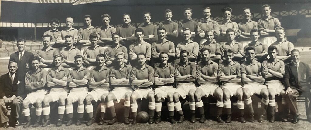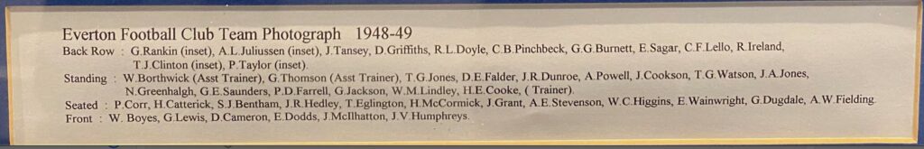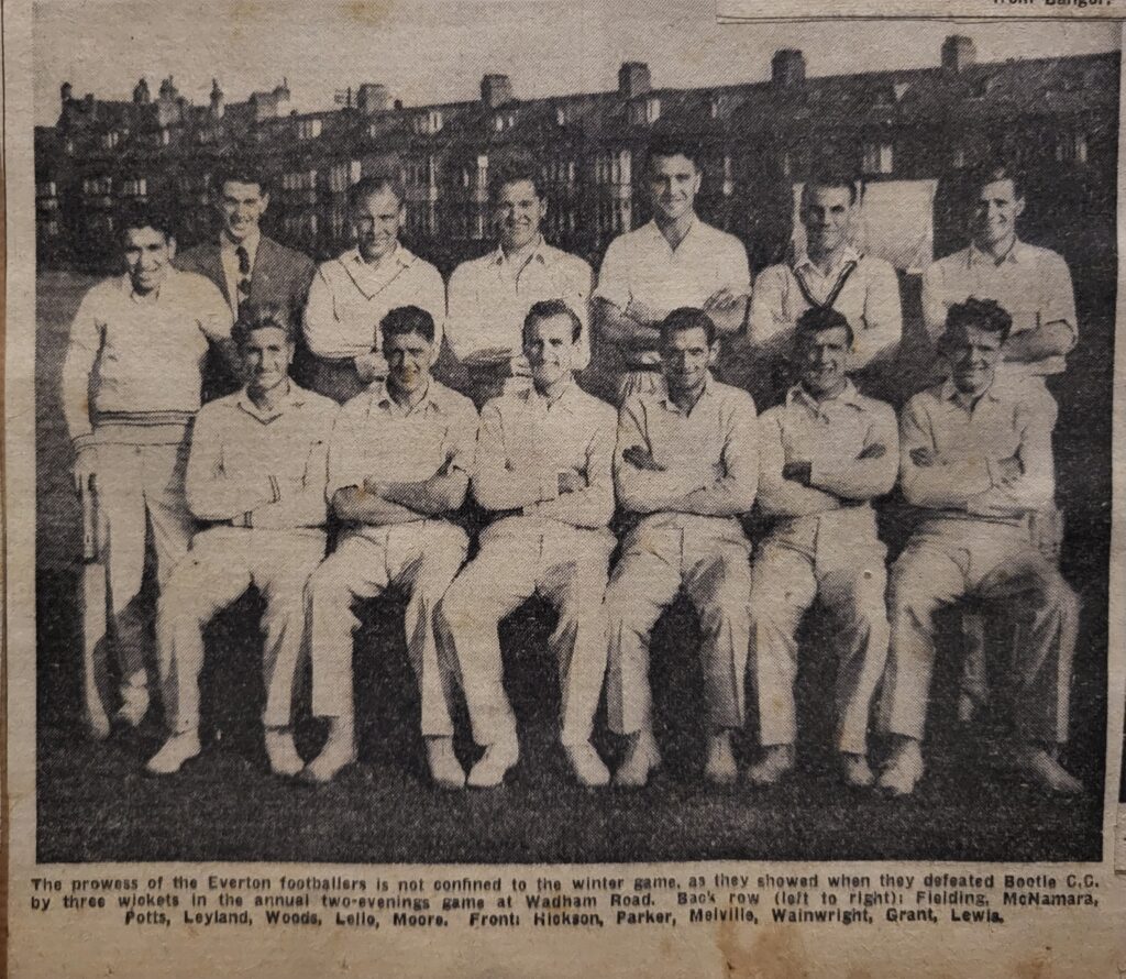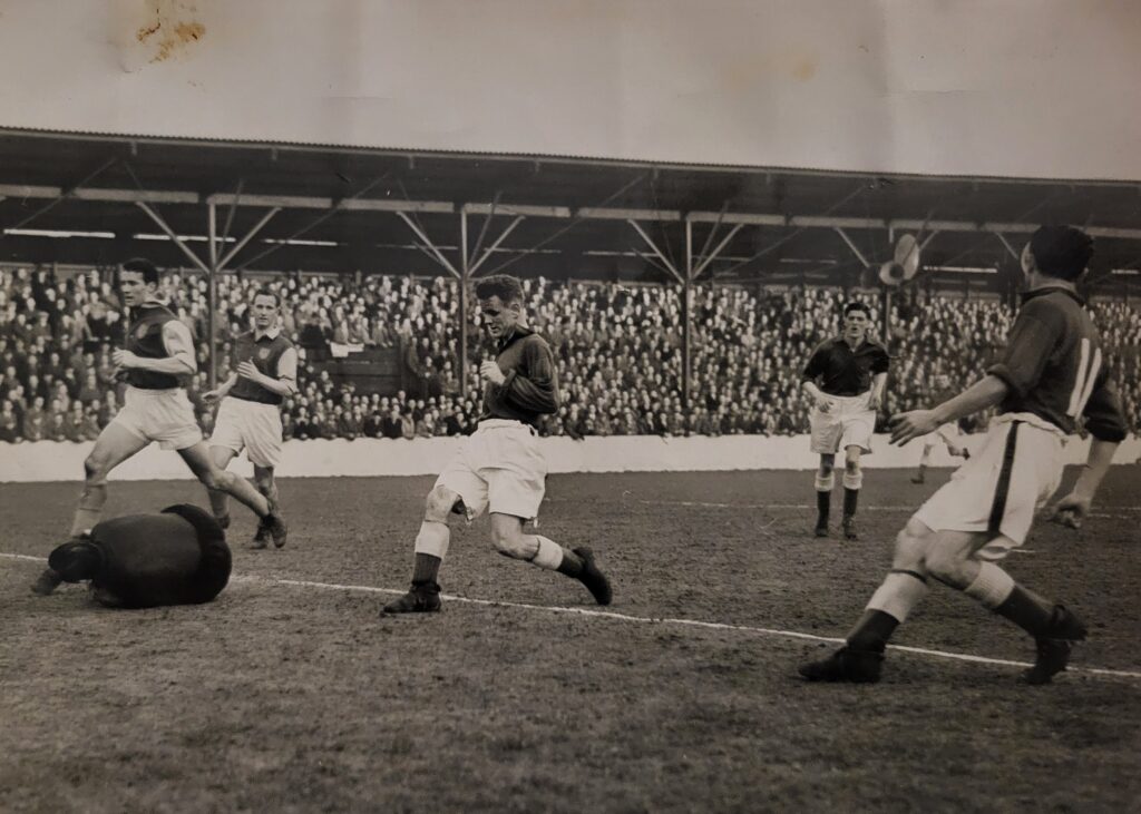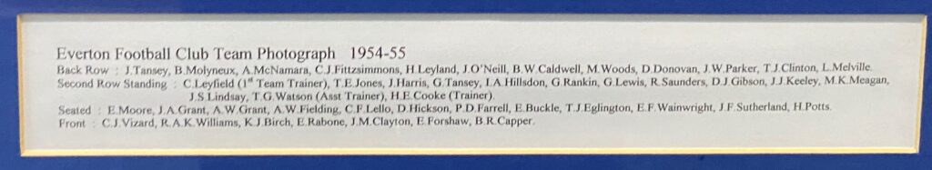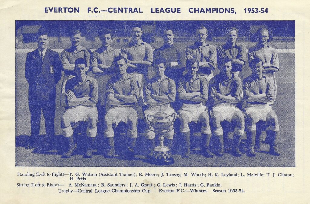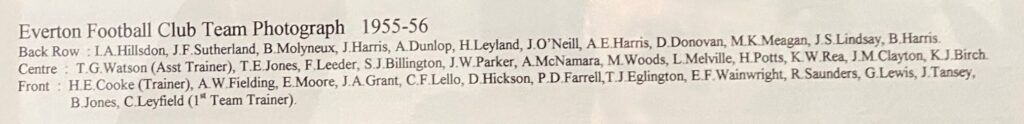 The following season, in which the Toffees gained promotion back to the top flight, he got a meagre three starts, scoring in two of them – one of which was an important 3-1 defeat of Lincoln City at Goodison during the run-in. He got his Division One career off to a good start in September 1954 with a goal in his first outing, a 2-2- home draw with Leicester City. He opened his account in the 29th minute with a neat finish after interplay with Irish duo Peter Farrell and Tommy Eglington. The Football Echo described the goal in these terms:
