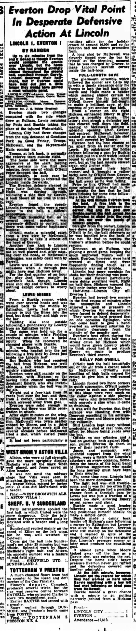 The move had its beginning well in the Everton half, when Farrell switched the ball out to the left flank; Eglington rounding Froggatt put in a comparatively short pass which Lewis took in his stride and rammed home with a grand shot just out of Dickson’s reach.