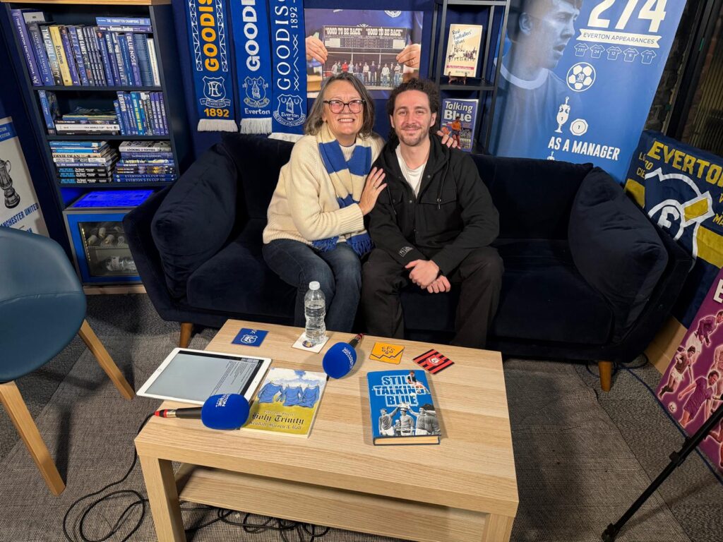 Becky Tallentire has been a much loved journalist and author of classic Evertonia for the last thirty years. The lady behind ‘Talking Blue’ ‘Real Footballers Wives’, and ‘Gwladys St’s Holy Trinity’, Becky is on the blue sofa to discusses her close connections to the EFC legends, from her first interview with Howard Kendall to witnessing Goodison’s final day with the players on the pitch.