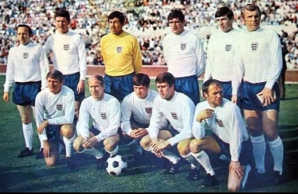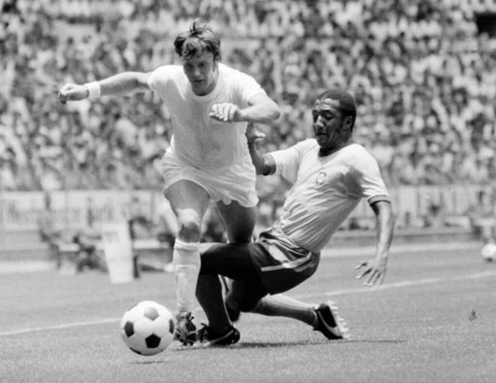 In the sweltering early afternoon June heat of Estádio Jalisco, Guadalajara, England’s right-back slumps to the ground. Lying prone, he is approached by Brazil’s number ten, the great Pelé, who proceeds to lift his opponent’s leg and push the foot back in an attempt to alleviate the symptoms of cramp.