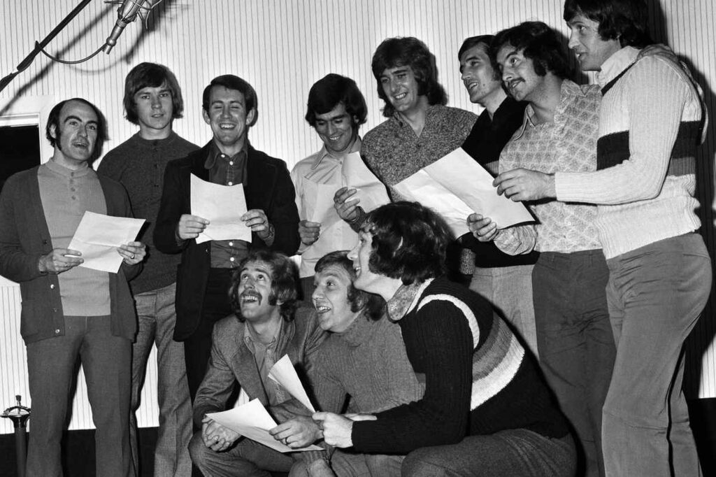 Part of the England soccer team record the World Cup song ‘Back Home’ at the Pye recording studio in London.