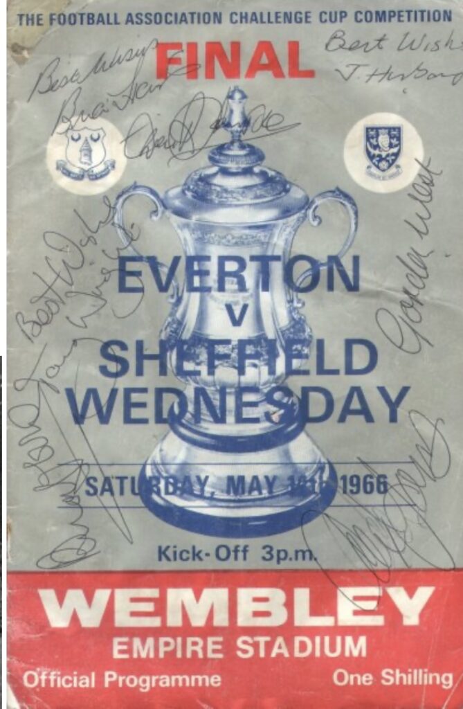 ‘I was tasked with looking after some of the players in the private lounge before the main event started. This included arranging photographs and group shots to record the occasion. Needless to say, I soon took advantage of my fortunate situation and asked the photographer to take a few for my collection. Imagine how overawed I was finding myself standing between two of my all time heroes, Alex Young and Tommy Wright. It was like I was ten years old again. I had a chat with Tommy, but with me being star struck, and he being his quiet humble self, it was never going to be an in-depth conversation. Nevertheless, he signed my 1966 FA Cup programme, which for me it was an unforgettable moment, now twenty-six years ago, and one I’ll always cherish. Those Hall of Fame nights were always bonkers events. I think Tommy was overwhelmed by the whole occasion, in face of the absolute adoration from grown men, most of whom had grown up with those fabulous sixties sides, collecting their bubblegum cards, sending off tokens off the Typhoo-Tea packets for a treasured photo of Everton, while searching everywhere to find the amber away kit in Subbuteo. Such a brilliant footballer and loyal servant of the club, Tommy Wright will always be an integral part of that childhood memory.’