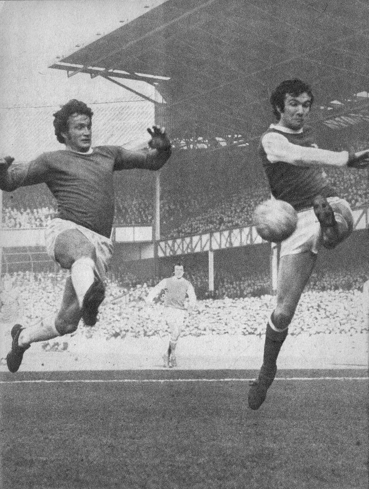 (Left: Showing his excellent leap at White Hart Lane in 1966. Below: Harvey, Ball and Wright 68-69 season)