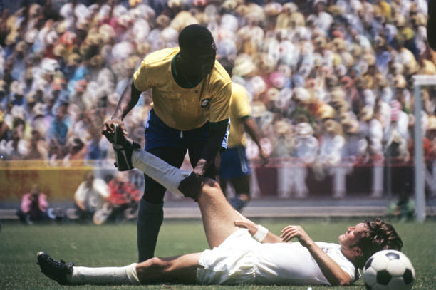 Pele (10) of Brazil tends to cramp-stricken Tommy Wright (14) of England after sustaining an injury during their Group 3 match at Estadio Jalisco, Guadalajara, Mexico, 6 July 1970 (photo; Neil Leifer)