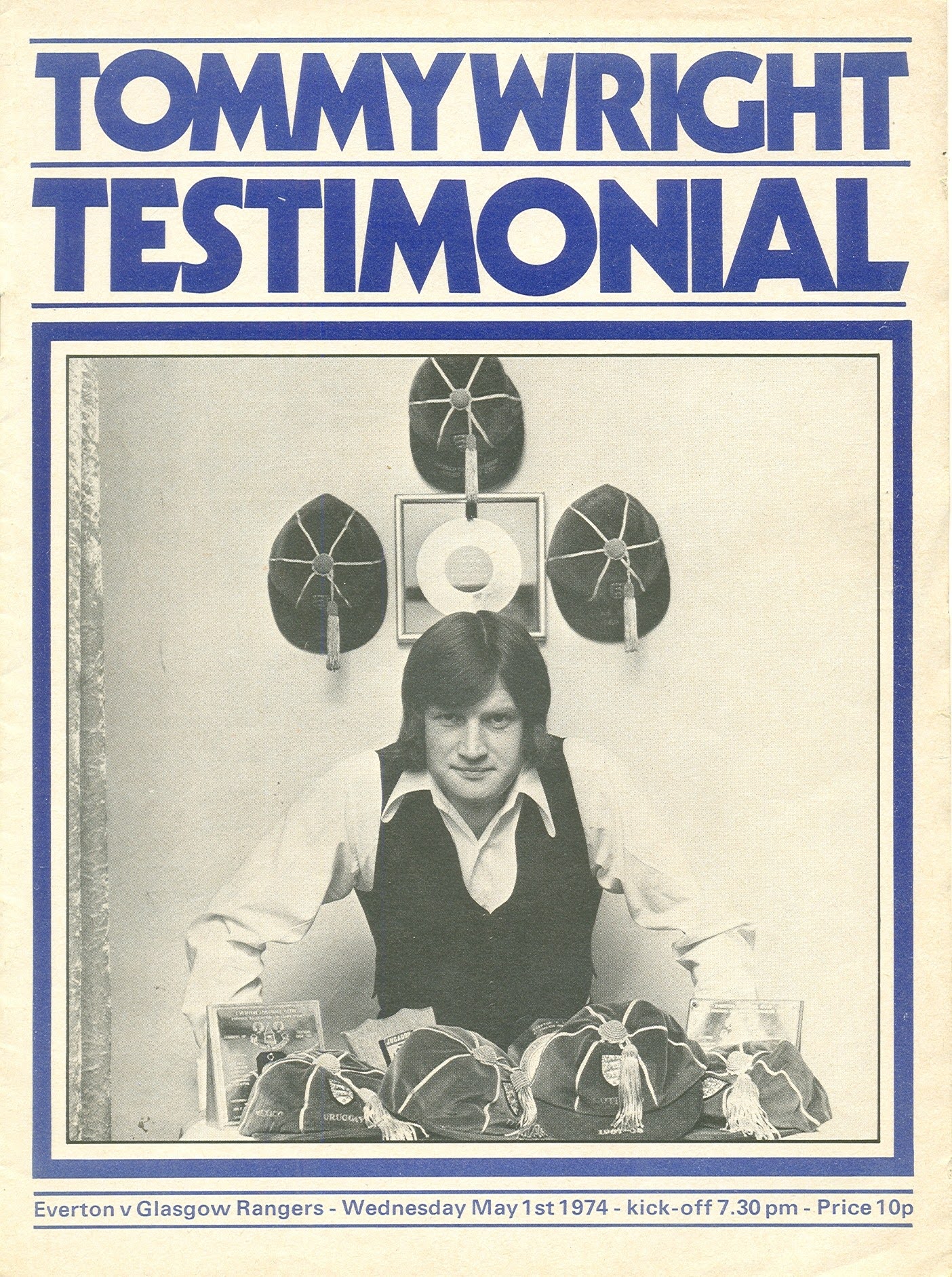 In the wake of the news of Tommy’s retirement from football, a testimonial match was arranged, to be played against Rangers at Goodison Park in May 1974. The match programme included tributes from Brian Labone, Gordon West and former England teammate Bobby Charlton. Tommy used the publication to thank everyone connected to the club for his playing career.