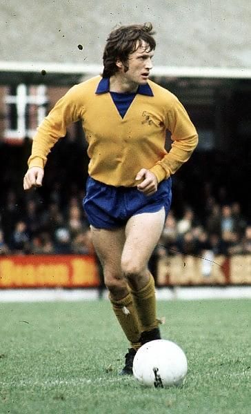 Tommy in the iconic amber and blue away kit in 1970 (right) and in 1972 with the added monogram (left).